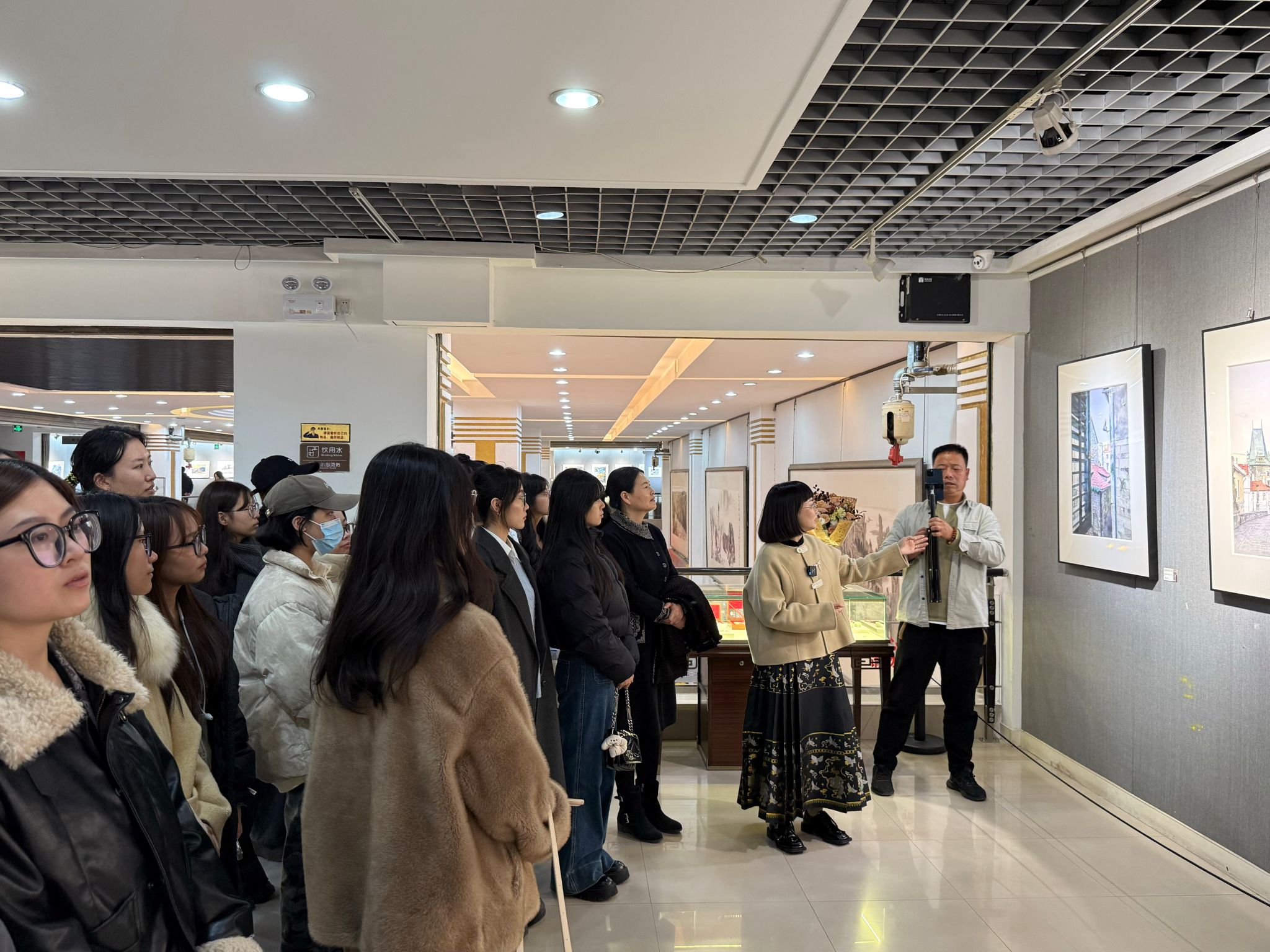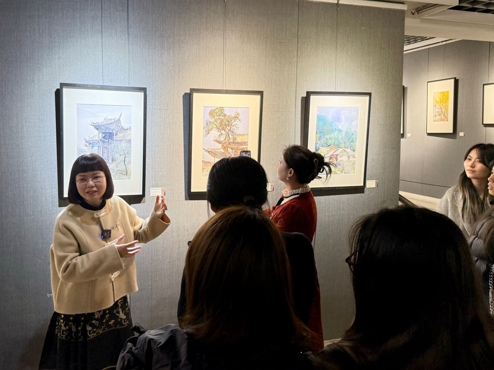 展览汇聚了五位艺术家近年来在欧洲、新加坡、青岛、西安、陕北等多地的写生与创作成果,作品题材广泛,涵盖风景、人物、静物、建筑、动物乃至抽象表达,充分展现了水彩艺术的多元面貌。造型系党支部书记曾军梅教授在讲解中表示,每幅作品不仅凝炼了自然与生活的瑰丽景象,更承载了创作者真挚的情感与深邃的思考,为观者营造了一方远离喧嚣、浸润心灵的艺术空间;杨毅柳老师进行了现场作画,在观摩过程中,师生认真聆听艺术家的专业讲解与深度解析。