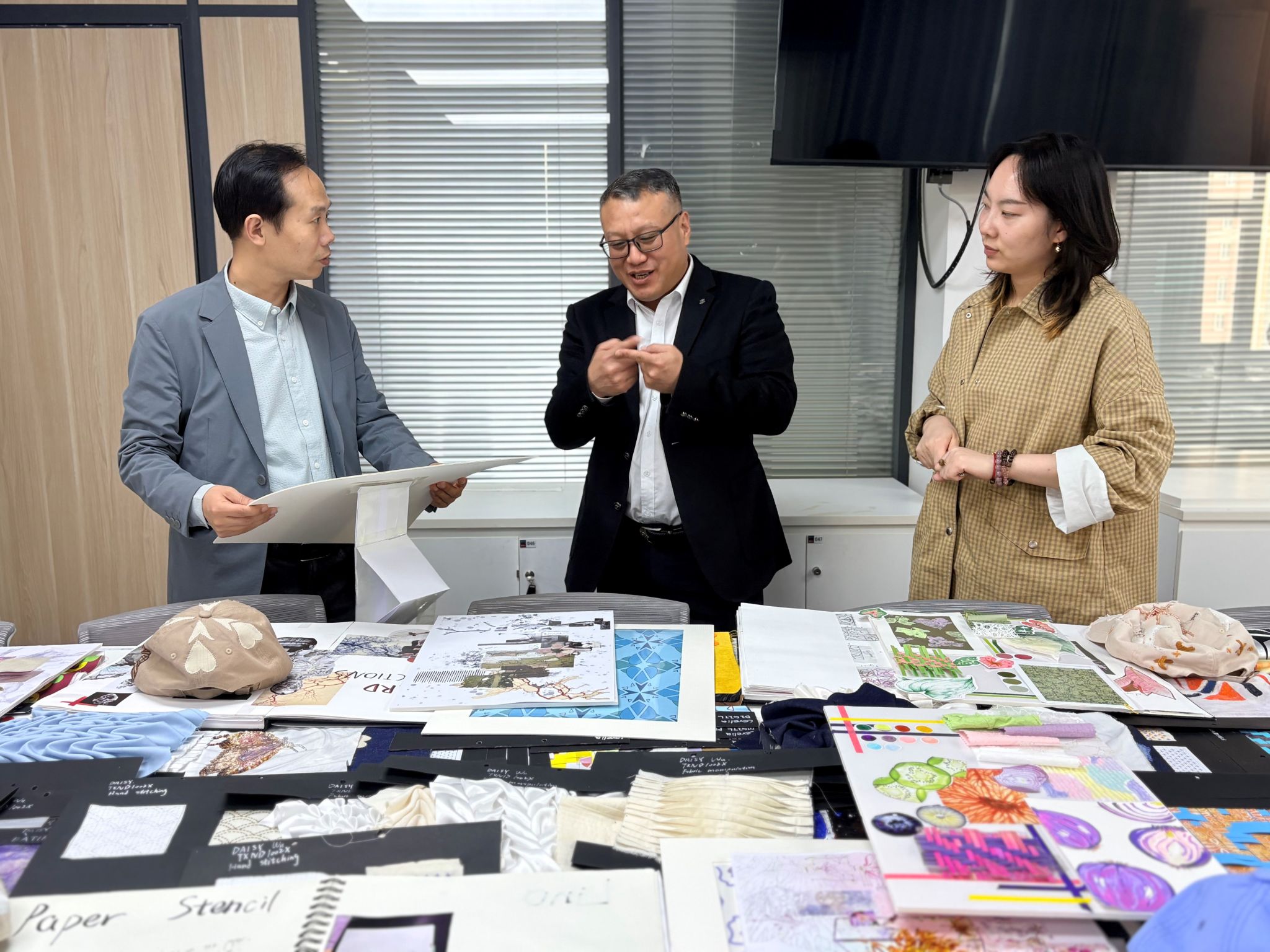 2026年4月23日,我校中外合作办学项目2024级全体学生面料再造课程作业展顺利举办。副校长杨建亲临展览现场指导,仔细观看了学生作品,并就课程教学、学生专业发展及中外合作办学项目的未来规划提出宝贵建议。